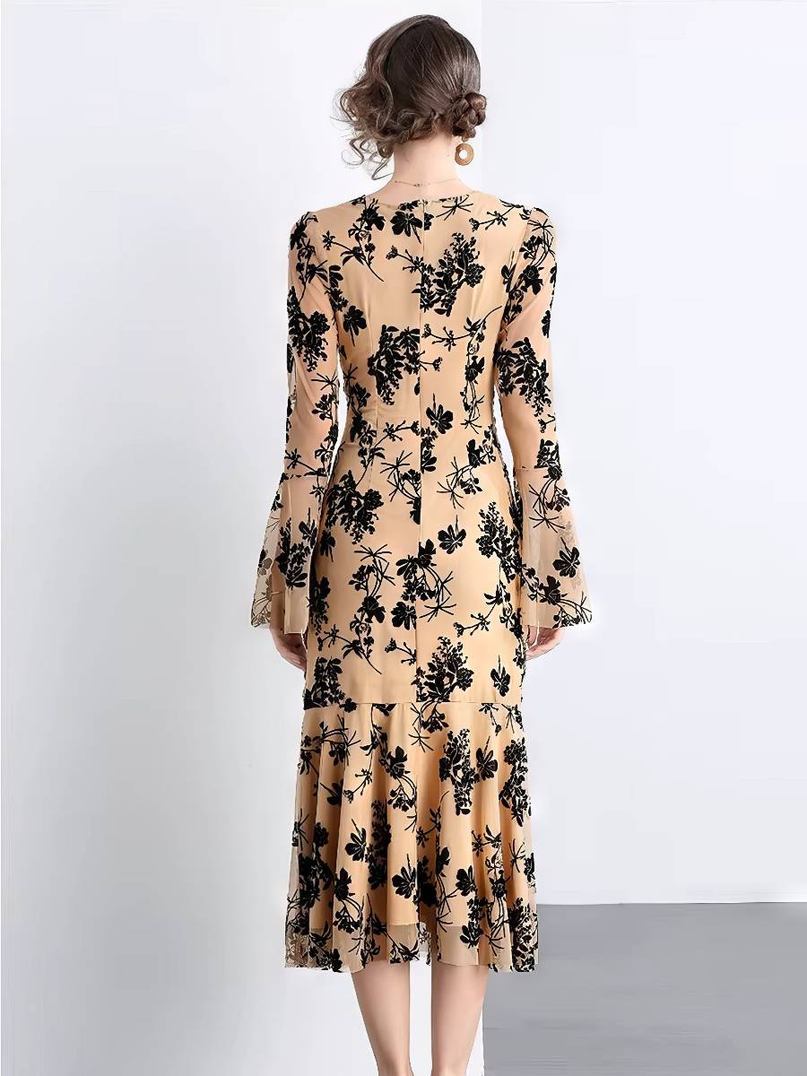 - Matière : Polyester avec voile semi-transparent et motifs floraux contrastés