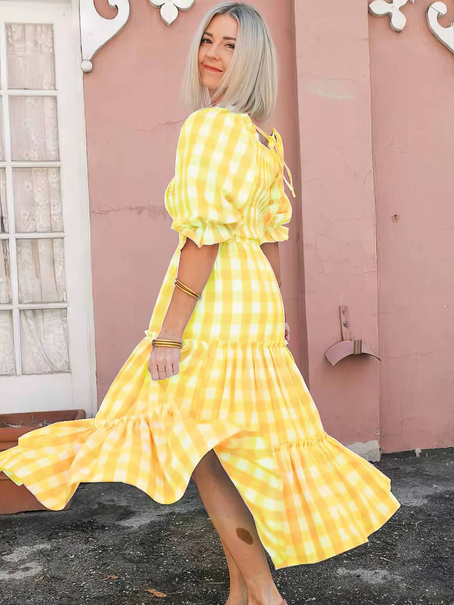 Robe Jaune Et Blanc Vichy Midi Manches Courtes