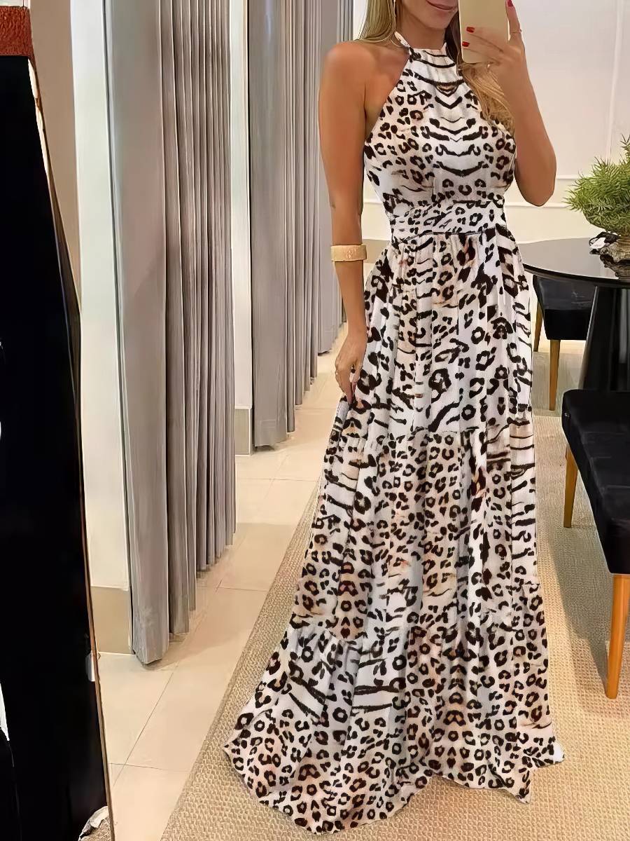 Robe Longue Beige Et Marron Imprimé Léopard Col Halter