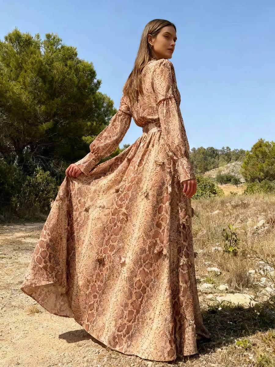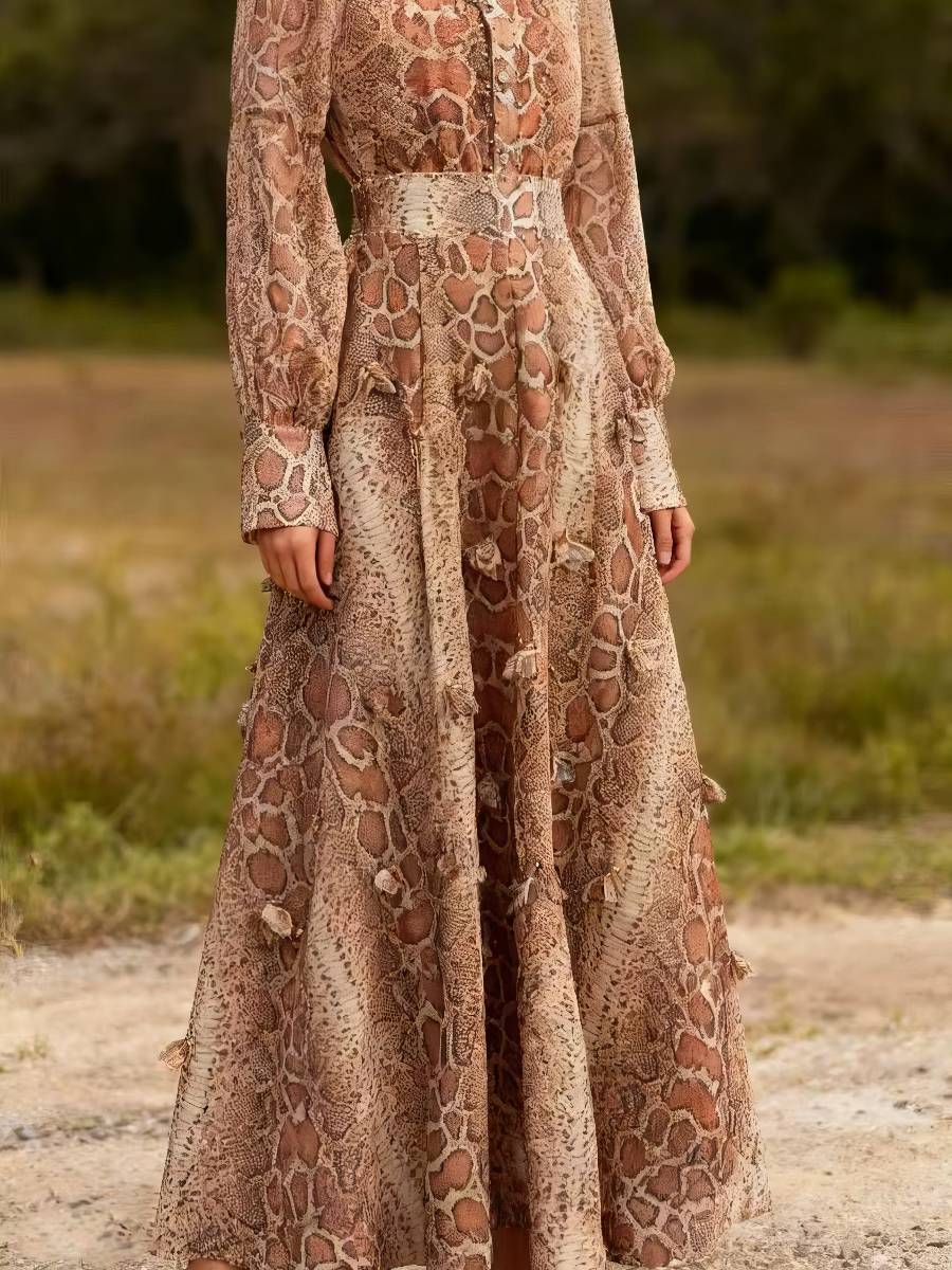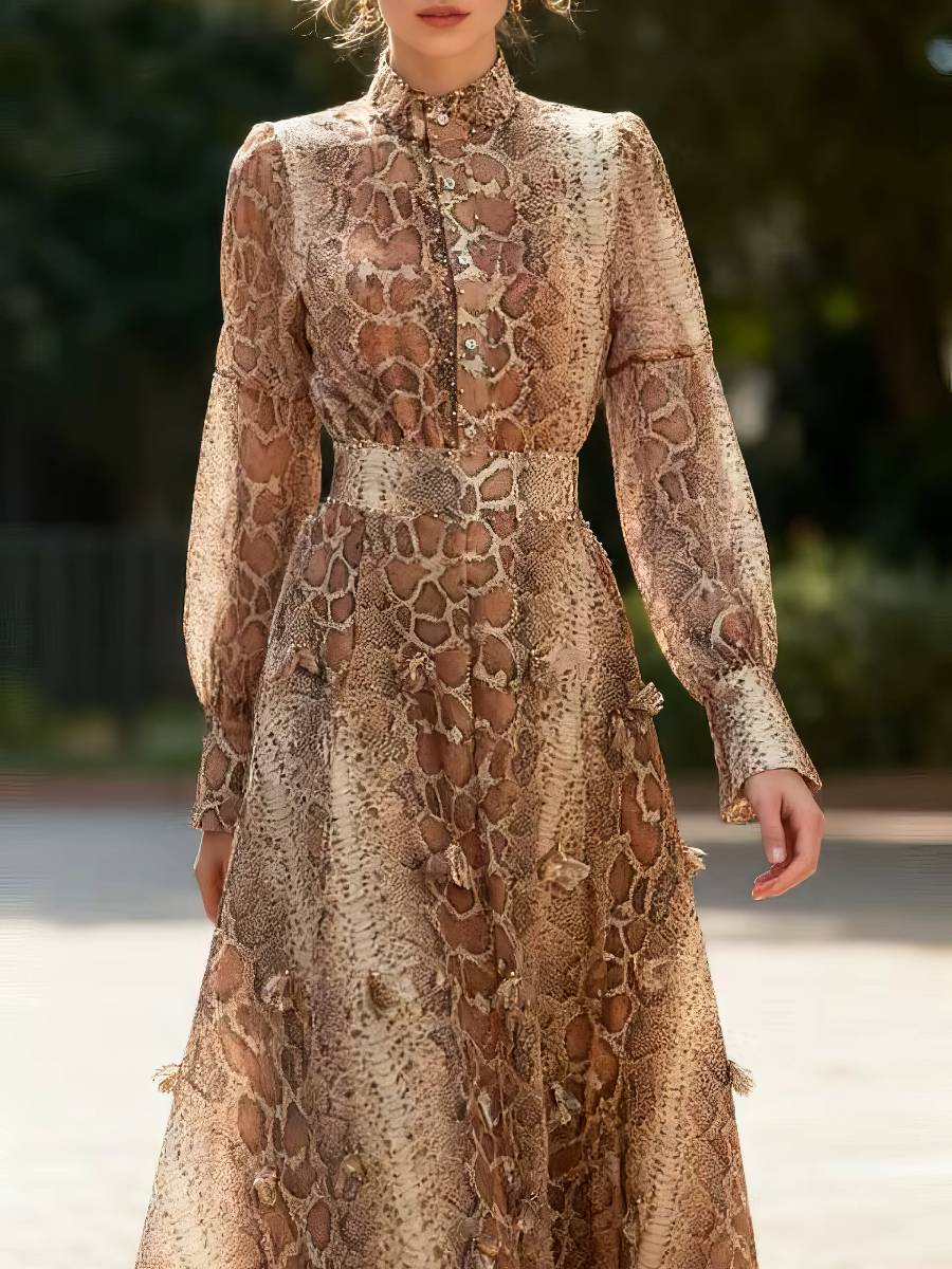 Robe Longue Beige Et Marron Imprimé Serpent Col Montant